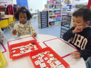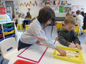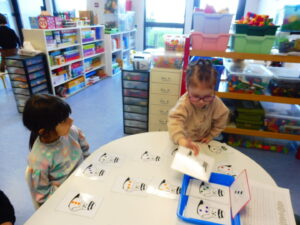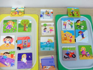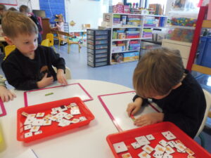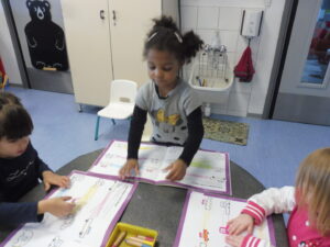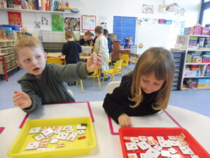 En langage oral, nous avons travaillé sur la compréhension orale. La maîtresse lit une phrase et nous devons retrouver l’image correspondant à la phrase .