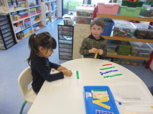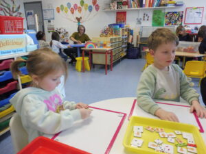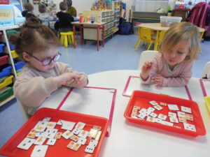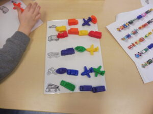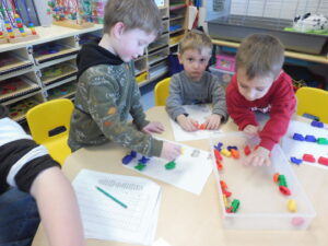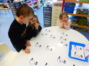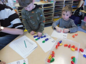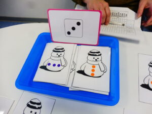 En numération, nous avons travaillé sur la reconnaissance des collections de 3 objets. Nous avons d’abord joué avec les cartes bonhommes de neige. Nous devions retrouver sur la table les bonhommes avec 3 boutons.