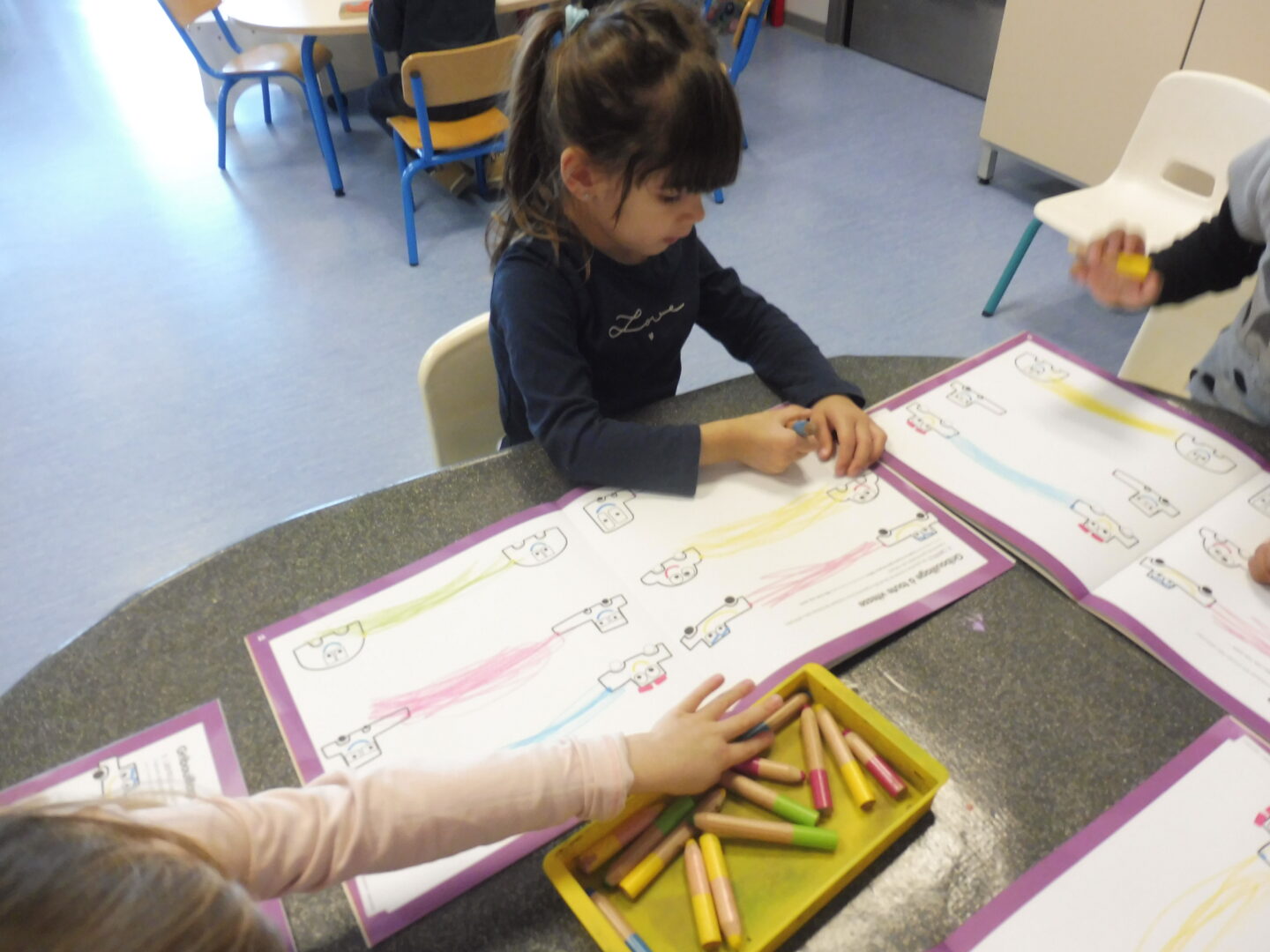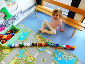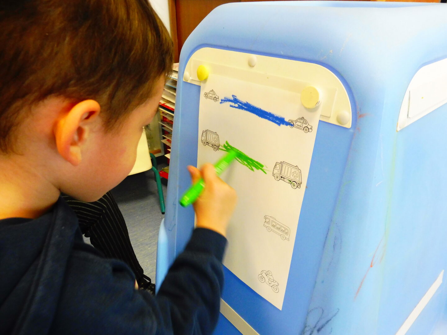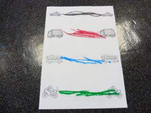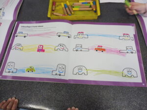 Pour poursuivre notre travail sur l’horizontale, nous avons travaillé sur le mouvement de va et vient horizontal avec une voiture, puis avec le crayon entre deux voitures.