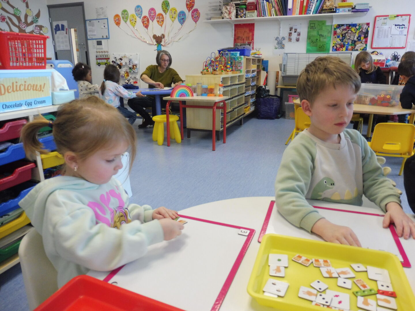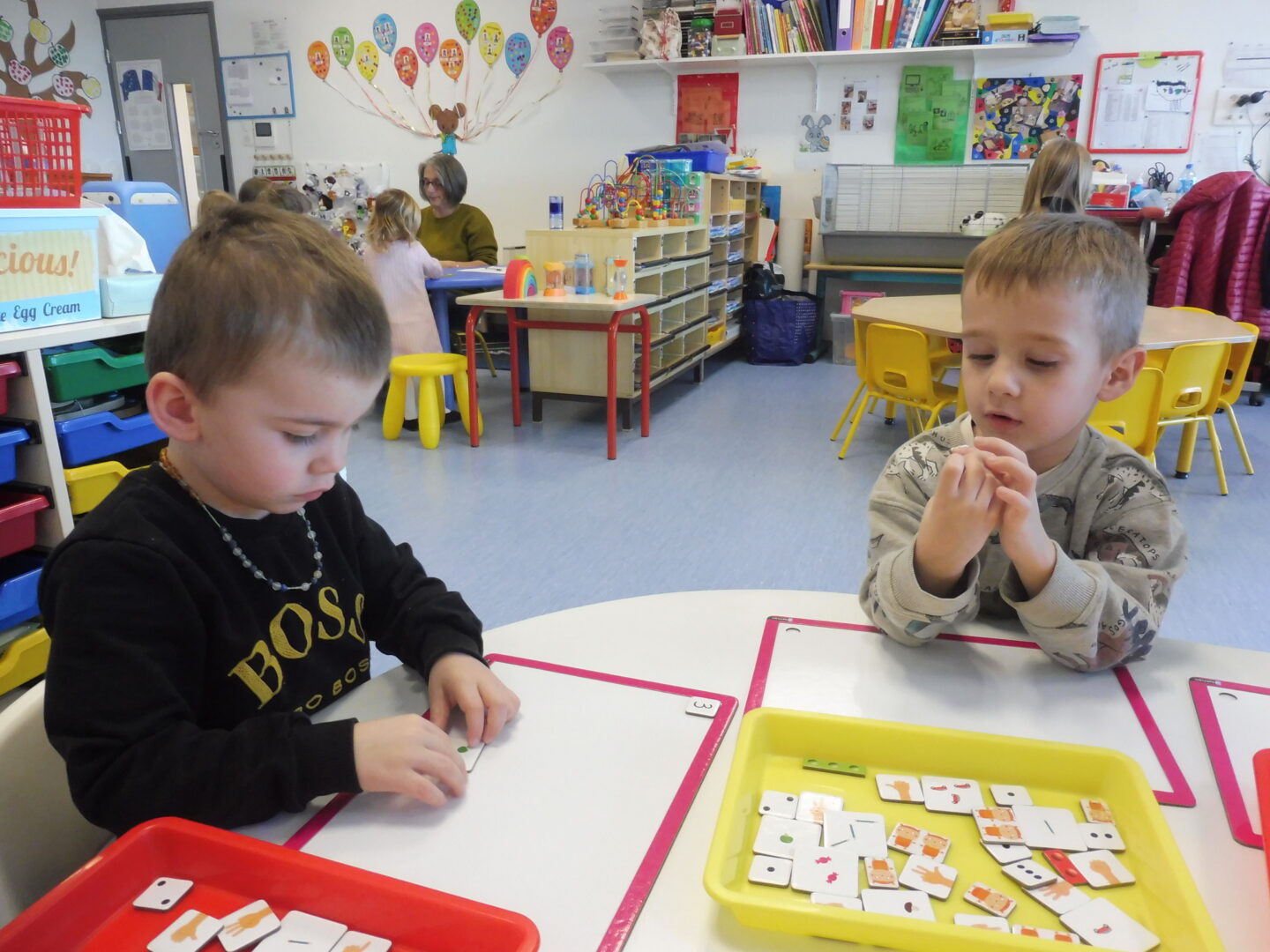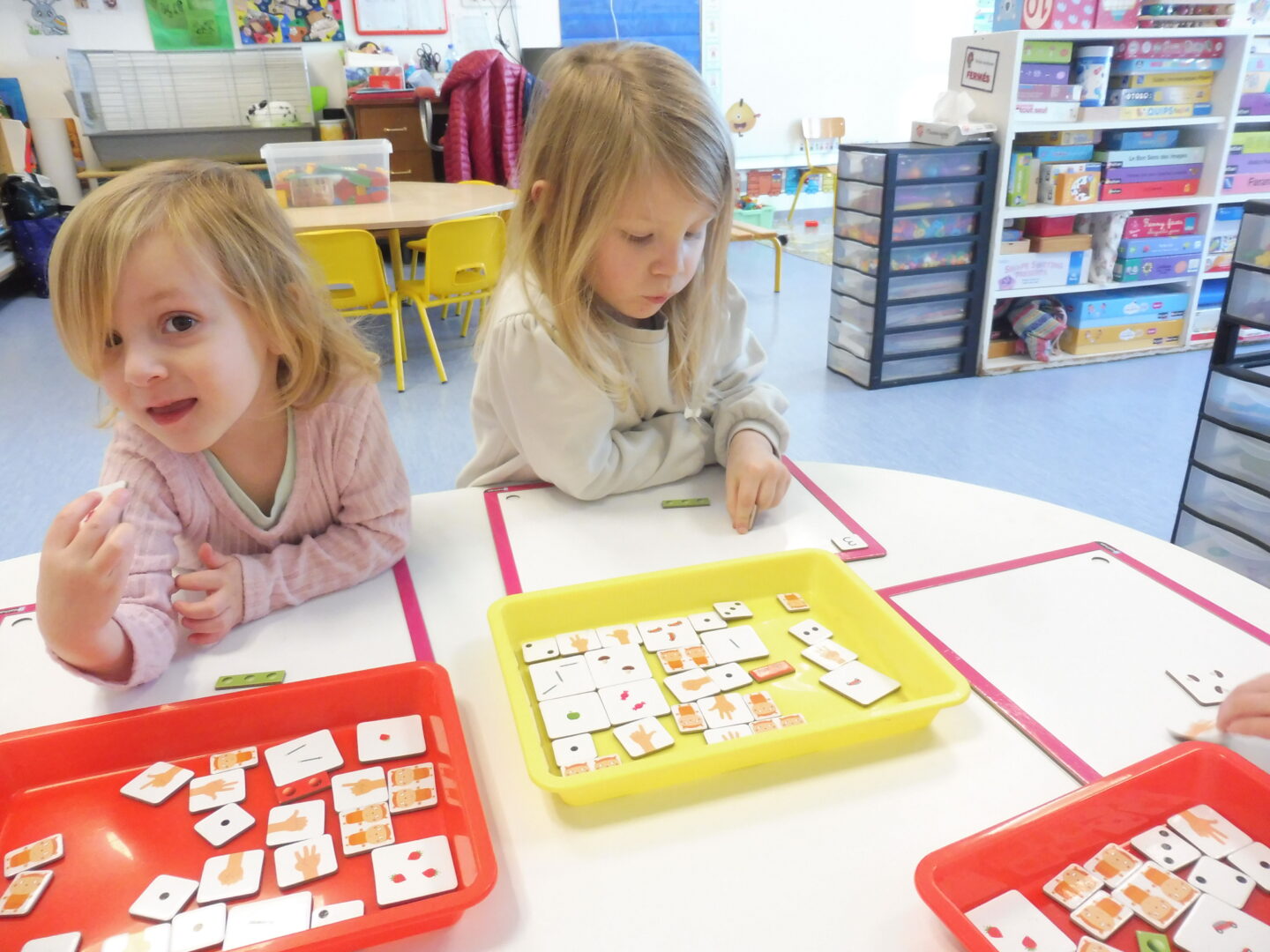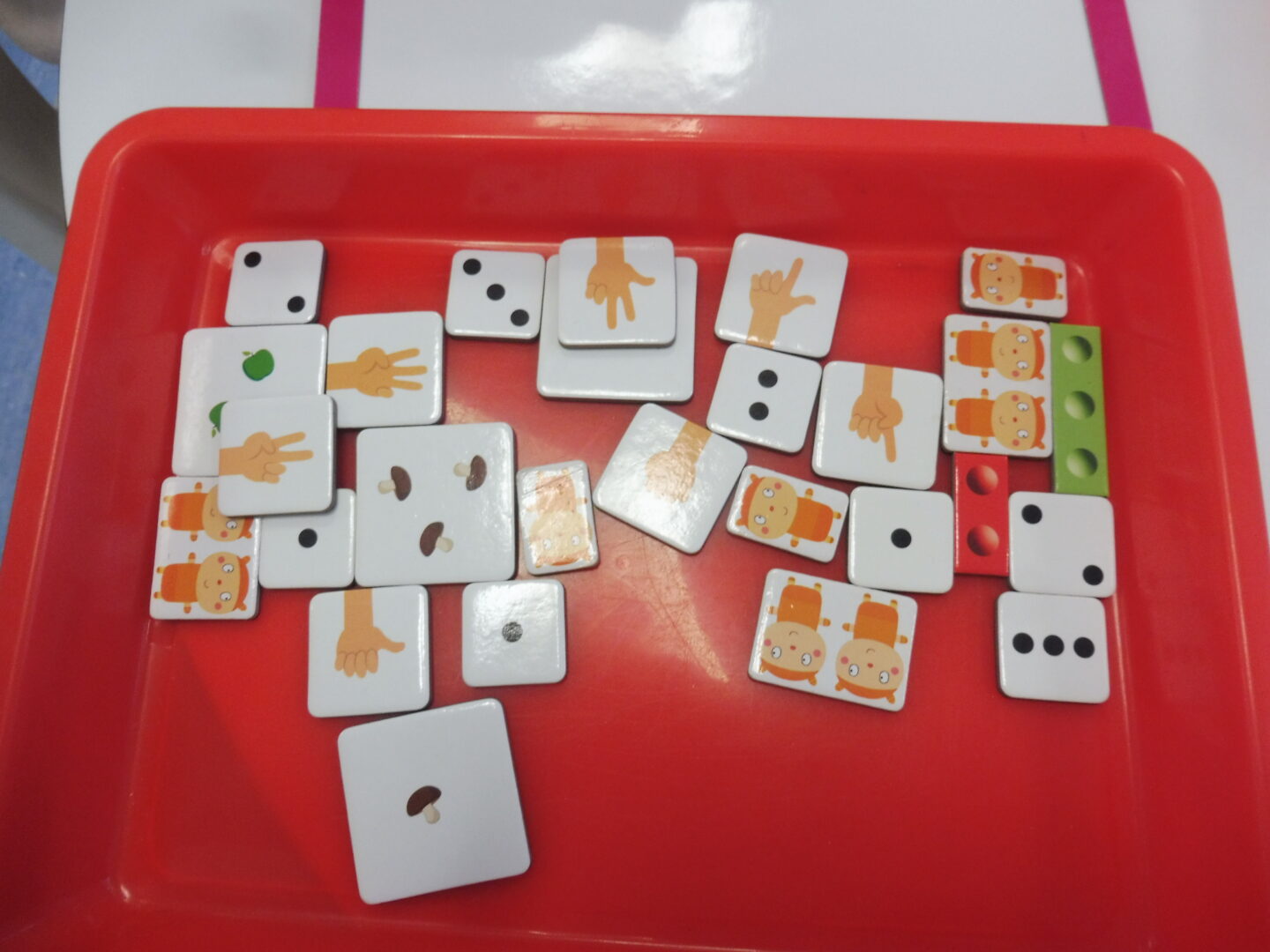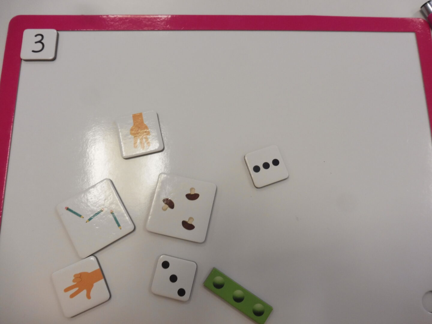 Puis la maîtresse nous a donné une ardoise et une boîte avec pleins d’étiquettes. Nous devions placer sur l’ardoise les étiquettes avec 3 objets, 3 doigts, 3 points.