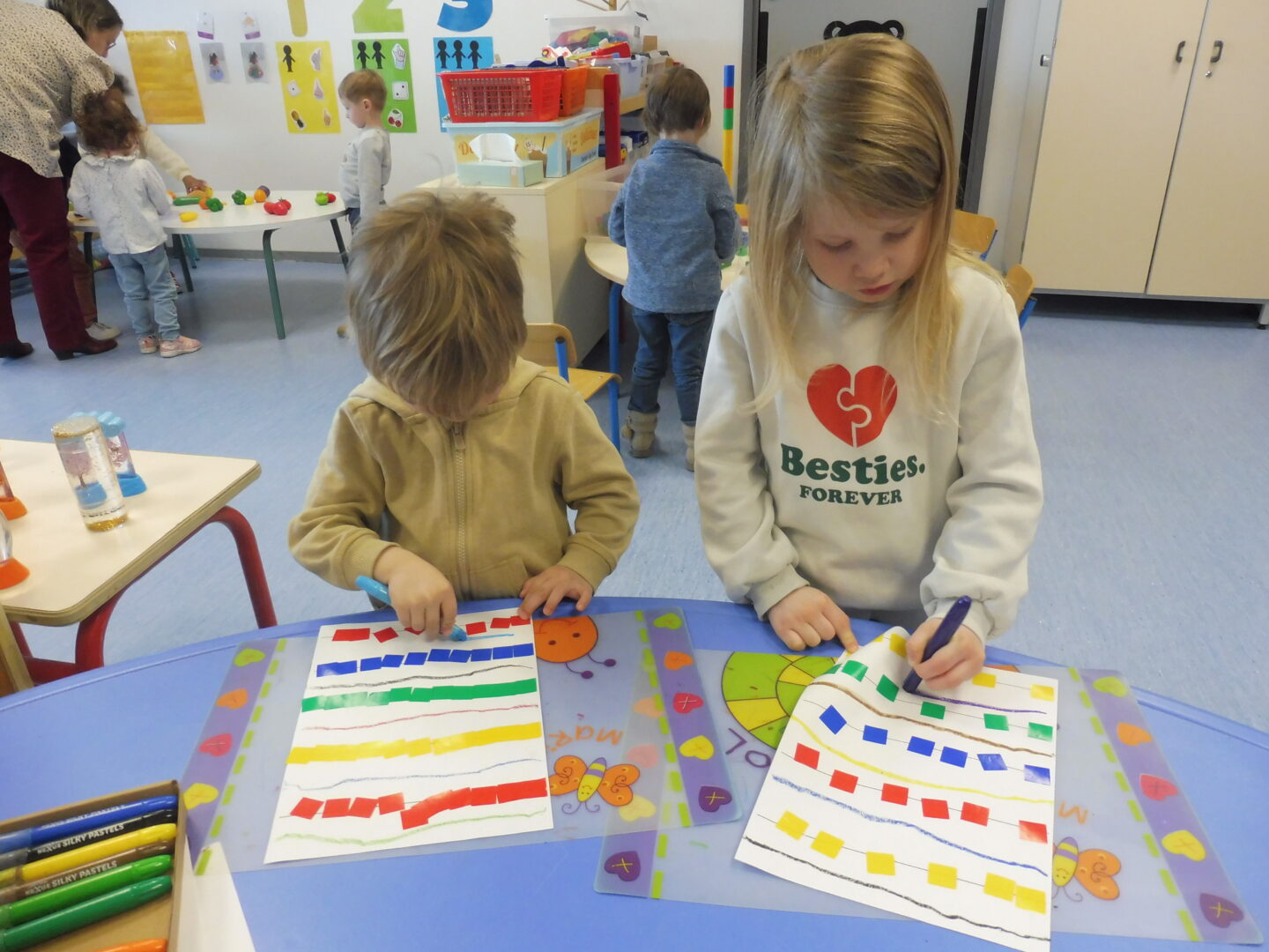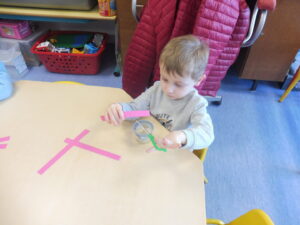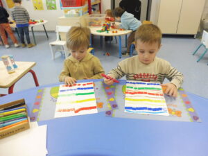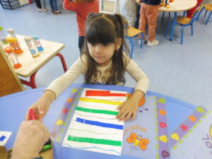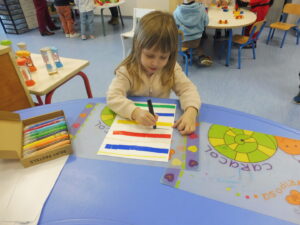 Cette semaine, nous avons continué notre travail sur la ligne horizontale.Nous avons commencé par tracer des traits horizontaux entre les lignes de gommettes.