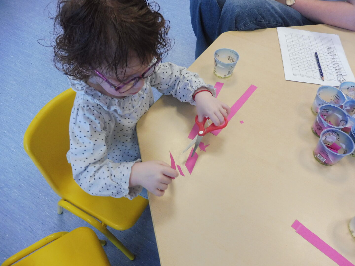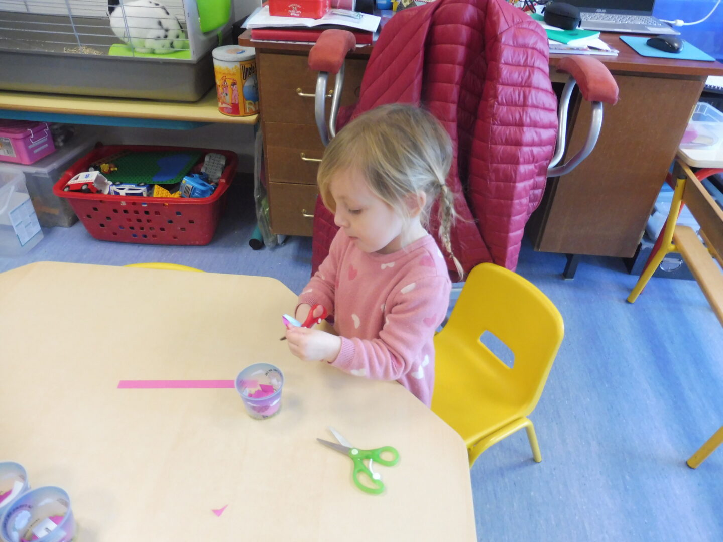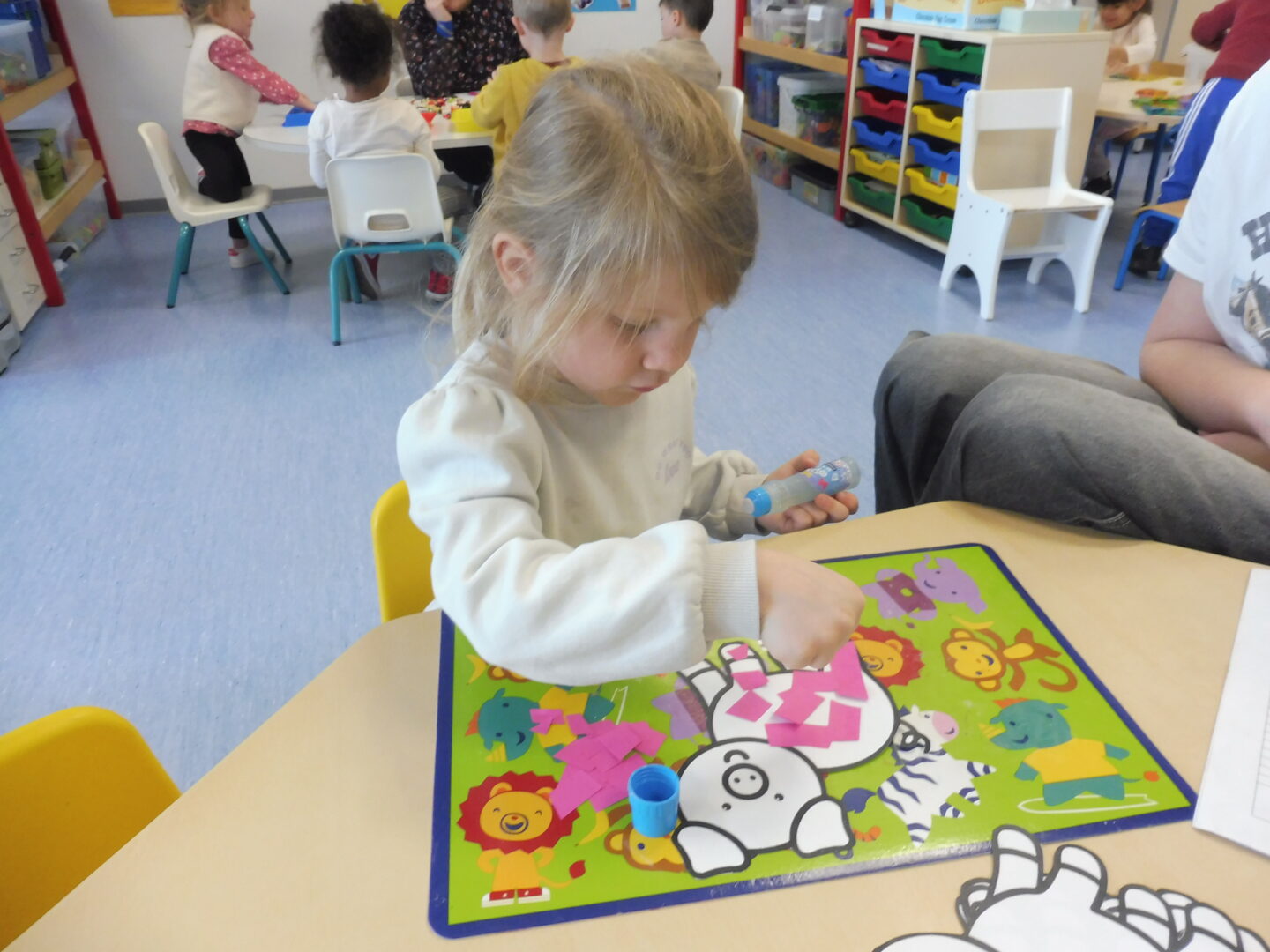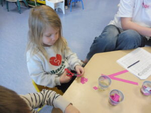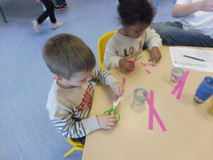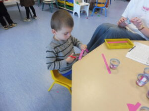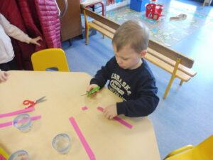 En motricité fine, nous avons continué notre travail sur le découpage commencé avant les vacances. Cette fois-ci nous avons découpé du papier rose avec le ciseau. Puis nous avons collé les papiers sur le cochon.