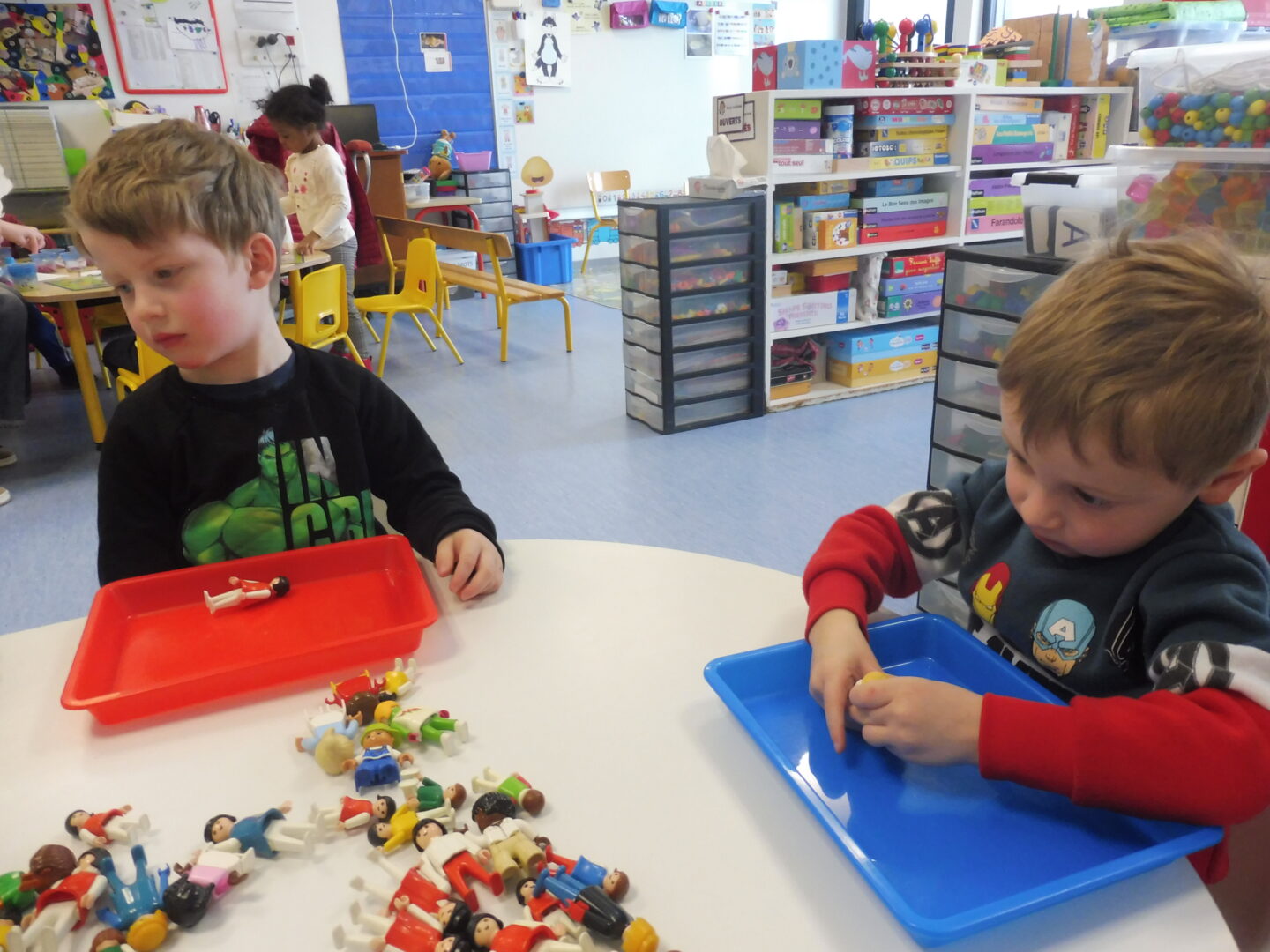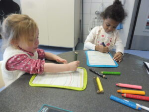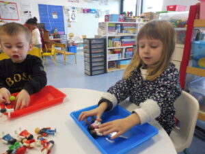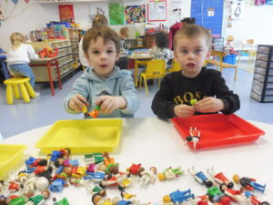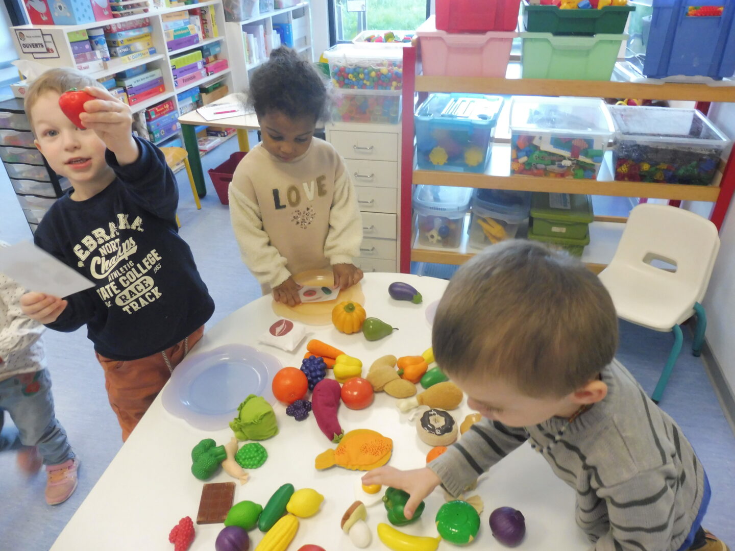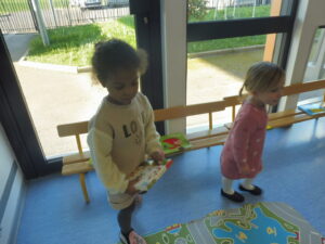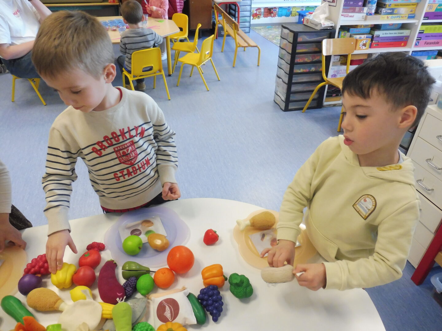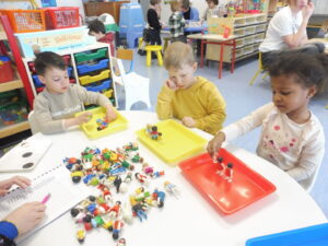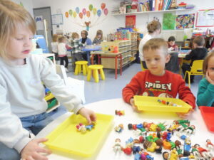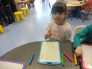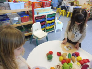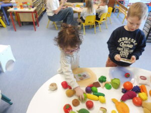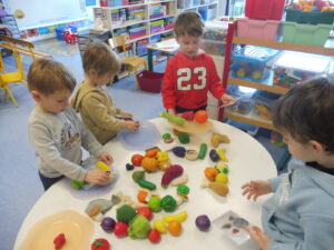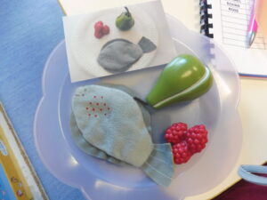 En numération, nous avons travaillé sur la construction d’une collection identique à une autre. Tout d’abord nous avons joué au jeu des assiettes. La maîtresse nous a donné une photo avec 3 aliments. Nous devons aller chercher les aliments sur la table et ramené notre assiette pour que la maîtresse vérifie.