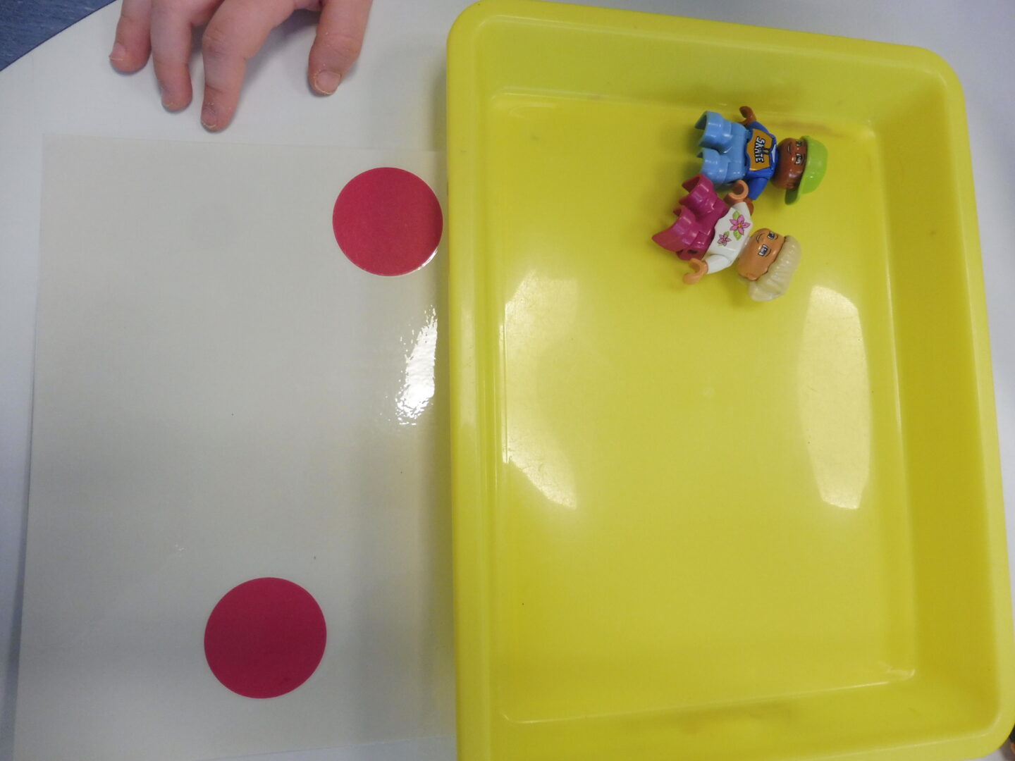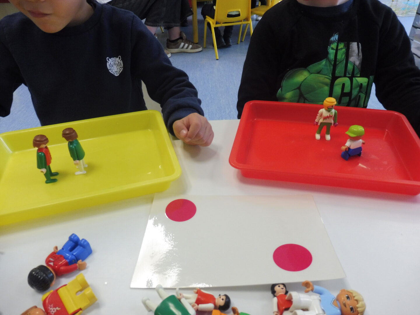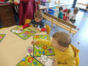 Puis nous avons joué au jeu des bonhommes. La maîtresse nous montre une carte avec des points, nous devons placer le même nombre de bonhommes que de points.